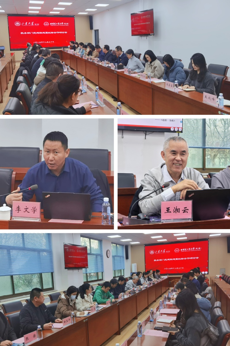 为深入贯彻落实新时代党的建设总要求,推动党建工作与业务工作深度融合,2025年12月30日下午,哈尔滨工业大学(威海)教务处与山东大学(威海)教务处党建联建暨校际合作研讨会在哈工大(威海)五号会议室成功举办。会议以“党建引领聚合力,校际协同促发展”为主题,通过专题党课、合作研讨等形式,凝聚共识、共谋发展。