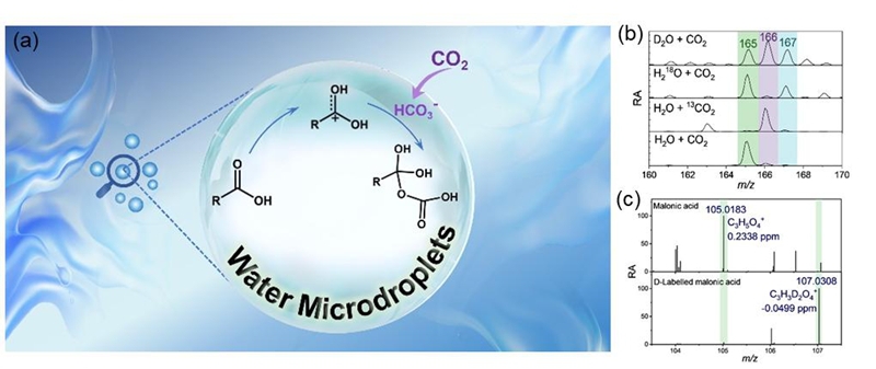 要精准防控PM2.5,厘清其关键组分二次有机气溶胶(SOA)的来源是关键。当前,基于已知SOA生成途径建立了多种预测模型,但模型预测值比实地观察值低1-2个数量级,这种差异表明当前对SOA生成途径认知仍不完善。针对上述SOA来源缺失的科学问题,研究团队以大气中广泛存在的CO2为切入点,发现其能与二羧酸在大气液滴表面自发反应,生成低挥发性化合物。为了揭示反应机理,团队自主开发了在线质谱方法,并结合自由基猝灭、同位素标记与高分辨质谱等技术,鉴定了传统方法难以直接观测的高活性碳正离子中间体,进而阐明了其与CO2解离产生的碳酸氢根发生反应的完整路径。