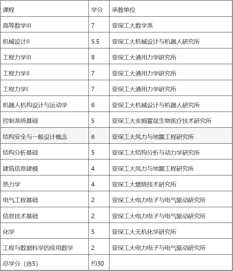 4+2项目中亚琛工业大学5门重要基础课程情况: